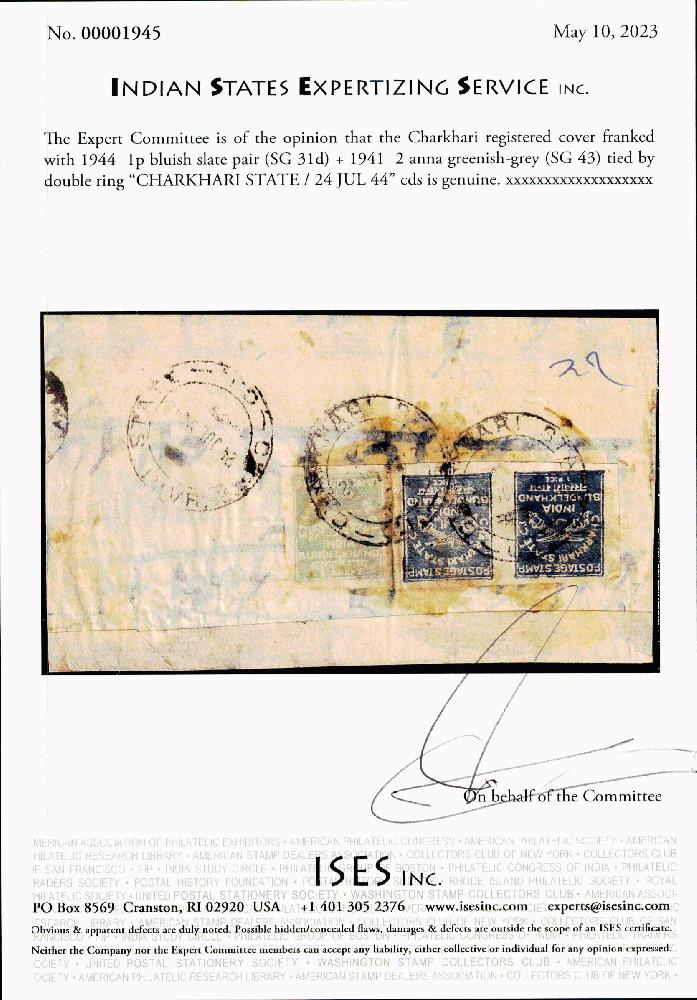 | Zusatzinformationen und Suchstichworte: | India and States Auction 25. Juni 2023 Los 52 Indien Staaten Charkhari Charkhari Einschreibebrief freigemacht mit 1944 1p bläulichschiefer Paar (SG 31d) und 1941 2 anna greenish-grey (SG 43) entwertet mit Zweikreis "CHARKHARI Staat/24 JUL 44" Kreisdatumsstempel. ISES Attest Ausruf 400,00 USD |