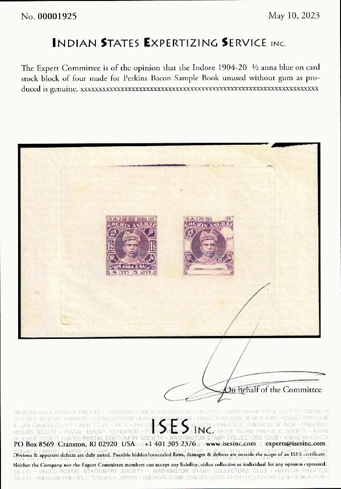 | Zusatzinformationen und Suchstichworte: | India and States Auction 25. Juni 2023 Los 57 Indien Staaten Cochin Cochin 1911 1½ anna Satzkünstlerentwurf in violett, zwei Abdrucke mit volles Urstempel Eindruck. Die links Prägung komplett, die richtigem Prägung unbearbeitet mit schwarz Wertfelder, die Schneckenmuschel Feld und Teil der oben Aufschrift sowie unausgefülltem für SG 31. möglicherweise einmalig und ein Pracht Artikel für beliebige Cochin Exponat. ISES Attest Ausruf 2.500,00 USD |