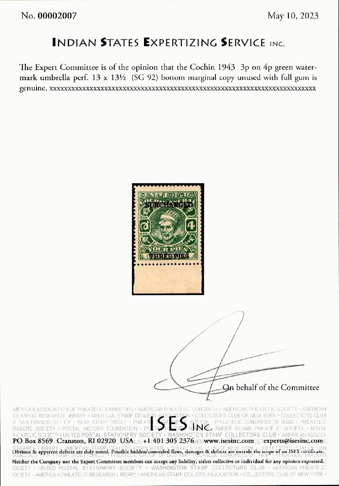 | Zusatzinformationen und Suchstichworte: | India and States Auction 25. Juni 2023 Los 60 Indien Staaten Cochin Cochin 1943 3p auf 4p grün Wasserzeichen Regenschirm Zähnung 13 x 13½ (SG 92) Unterrand Exemplar postfrisch, minimaler Bug nicht sichtbarer von vorne. ISES Attest Ausruf 150,00 USD |