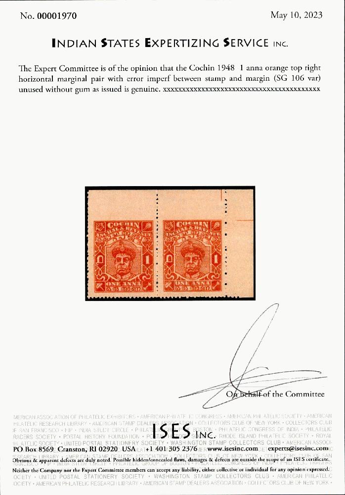 | Zusatzinformationen und Suchstichworte: | India and States Auction 25. Juni 2023 Los 62 Indien Staaten Cochin Cochin 1948 1 anna orange oben rechts waagrechtes Randpaar mit Fehler ungezähnt zwischen Marke und Rand (SG 106 var) ungebraucht ohne Gummi, wie verausgabt. ISES Attest Ausruf 150,00 USD |