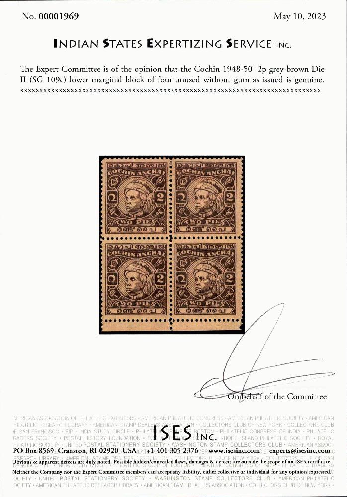 | Zusatzinformationen und Suchstichworte: | India and States Auction 25. Juni 2023 Los 63 Indien Staaten Cochin Cochin 1948-50 2p graubraun Platte II (SG 109c) niedriger Randviererblock ungebraucht ohne Gummi, wie verausgabt. ISES Attest Ausruf 150,00 USD |