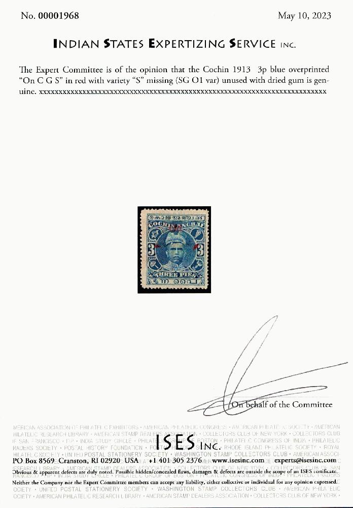 | Zusatzinformationen und Suchstichworte: | India and States Auction 25. Juni 2023 Los 65 Indien Staaten Cochin Cochin 1913 3p blau überdruckt "auf C G S" in rot mit Abart "S" fehlend (SG O1 var) ungebraucht mit ausgetrocknetem Gummi. Katalogwert für Normalmarke £170. ISES Attest Ausruf 250,00 USD |