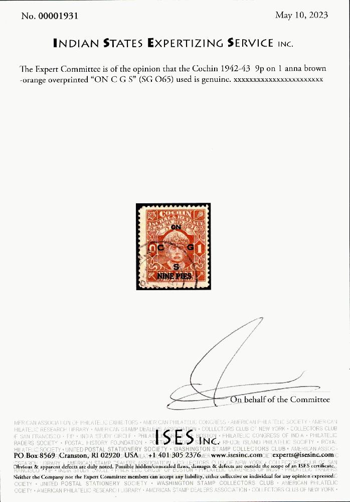 | Zusatzinformationen und Suchstichworte: | India and States Auction 25. Juni 2023 Los 66 Indien Staaten Cochin Cochin 1942-43 9p auf 1 anna braunorange überdruckt "auf C G S" (SG O65). ISES Attest Ausruf 45,00 USD |