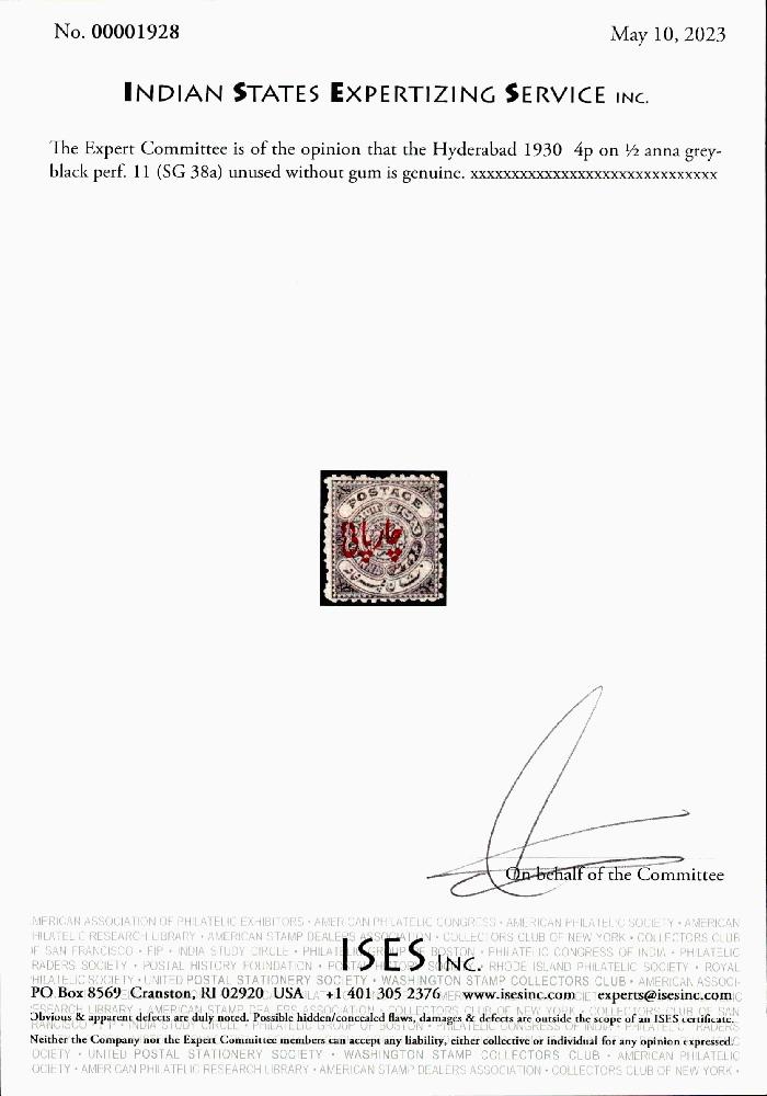 | Zusatzinformationen und Suchstichworte: | India and States Auction 25. Juni 2023 Los 77 Indien Staaten Hyderabad Hyderabad 1930 4p auf ½ anna grauschwarz Zähnung 11 (SG 38a) ungebraucht ohne Gummi. Note jenes im SG Katalog BEI DIESER MARKE HANDELT ES SICH gelistet mit ein "†" in ungebrauchter Erhaltung was darauf hindeutet, dass es ist nicht bekannt ungebraucht und als solcher möglicherweise einmalig. ISES Attest Ausruf 500,00 USD |
