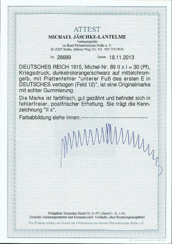 | Prüfer: | Jäschke-Lantelme, Michael (BPP (Bund Philatelistischer Prüfer)) |