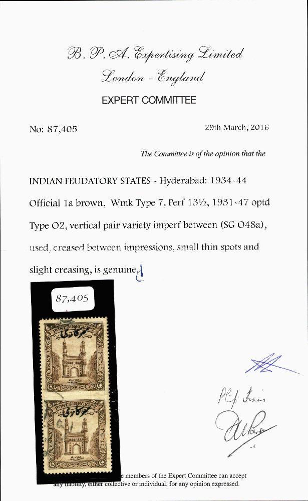 | Zusatzinformationen und Suchstichworte: | India and States Auction 25. Juni 2023 Los 83 Indien Staaten Hyderabad Hyderabad 1934-44 1 anna braun Wasserzeichen SG Typ 7, Zähnung 13½ überdruckt "Sarkari" SG Typ O2 mit Fehler zwischen den Marken ungezähnt senkrechtes Paar (SG O42a) gebraucht. Bug zwischen den Marken und etwas hell Flecke. BPA Attest Ausruf 200,00 USD |