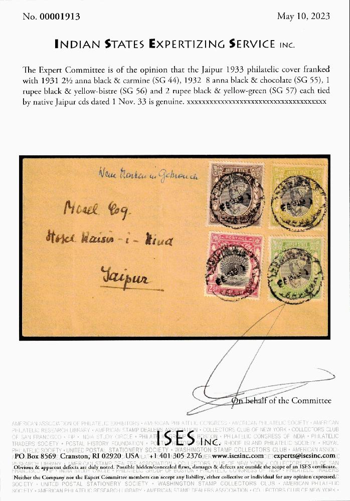 | Zusatzinformationen und Suchstichworte: | India and States Auction 25. Juni 2023 Los 89 Indien Staaten Jaipur Jaipur 1933 philatelistischer Brief freigemacht mit 1931 2½ anna schwarz & karmin (SG 44), 1932 8 anna schwarz und Schokolade (SG 55), 1 Rupien schwarz und yellow-bistre (SG 56) und 2 Rupien schwarz und gelbgrün (SG 57) jede entwertet mit inländischen Jaipur Kreisdatumsstempel datiert 1 Nov. 33. Katalogwert für gestempelte Marken lose £1813, auf Brief Katalogwert £7713. höchstwahrscheinlich einmalig. ISES Attest Ausruf 1.000,00 USD |