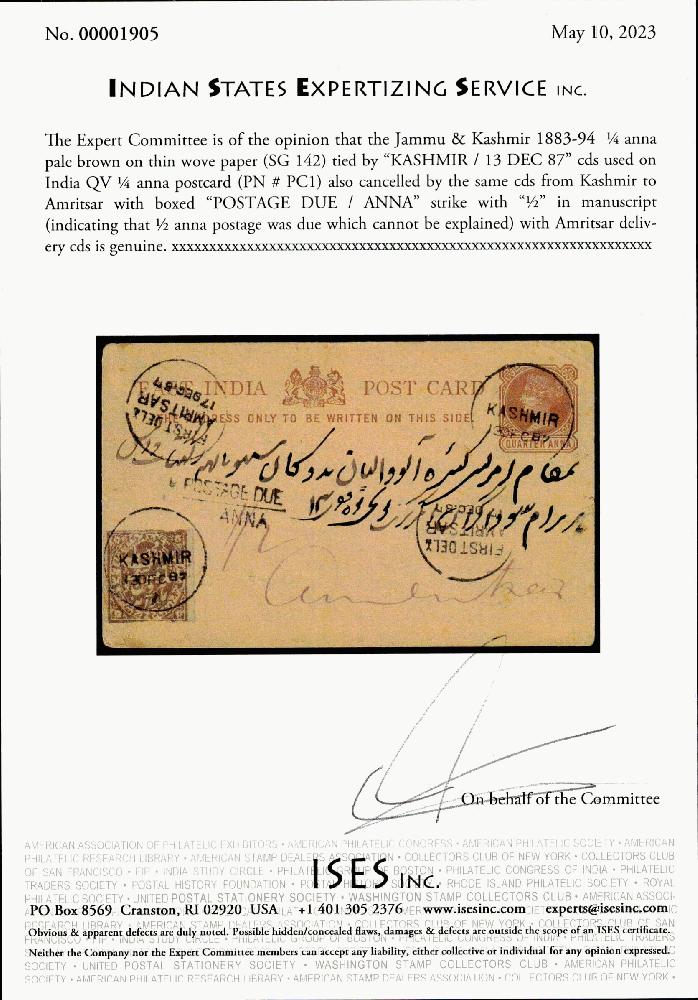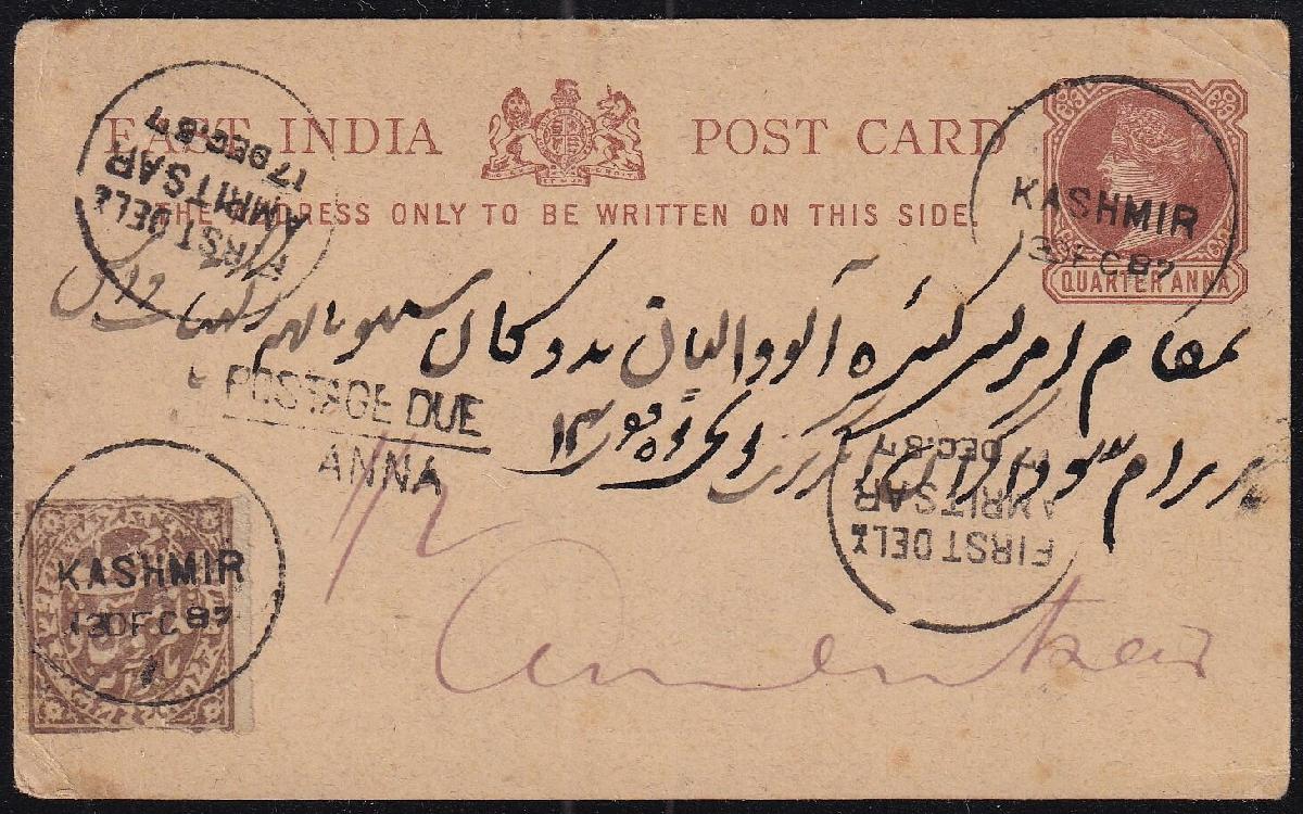 | Zusatzinformationen und Suchstichworte: | India and States Auction 25. Juni 2023 Los 94 Indien Staaten Kashmir Jammu und Kashmir 1883-94 ¼ anna hellbraun auf dünnem, genetztem Papier (SG 142) entwertet mit "Kashmir/13 DEC 87" Kreisdatumsstempel gebraucht auf Indiapapier QV ¼ anna Postkarte (PN # PC1) sowie gestempelt mit dem gleiche Kreisdatumsstempel ab Kashmir zu Amritsar mit gerahmtem "Nachgebühr/ANNA" Abschlag mit "½" handschriftlich (was darauf hindeutet, dass ½ anna Porto war geschuldet welches kann nicht sein erklärt) mit Amritsar Ablieferung Kreisdatumsstempel. ISES Attest Ausruf 50,00 USD |