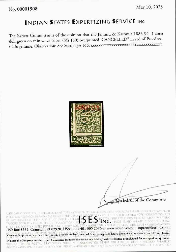 | Zusatzinformationen und Suchstichworte: | India and States Auction 25. Juni 2023 Los 96 Indien Staaten Kashmir Jammu und Kashmir 1883-94 Probe der 1 anna mattgrün auf dünnem, genetztem Papier (SG 145) überdruckt gestempelt" in rot ohne Gummi als hergestellt, diese Proben sind dokumentiert in "die Briefmarken von Jammu und Kashmir" bei Kröseln Staal, Blatt 146. ISES Attest Ausruf 150,00 USD |