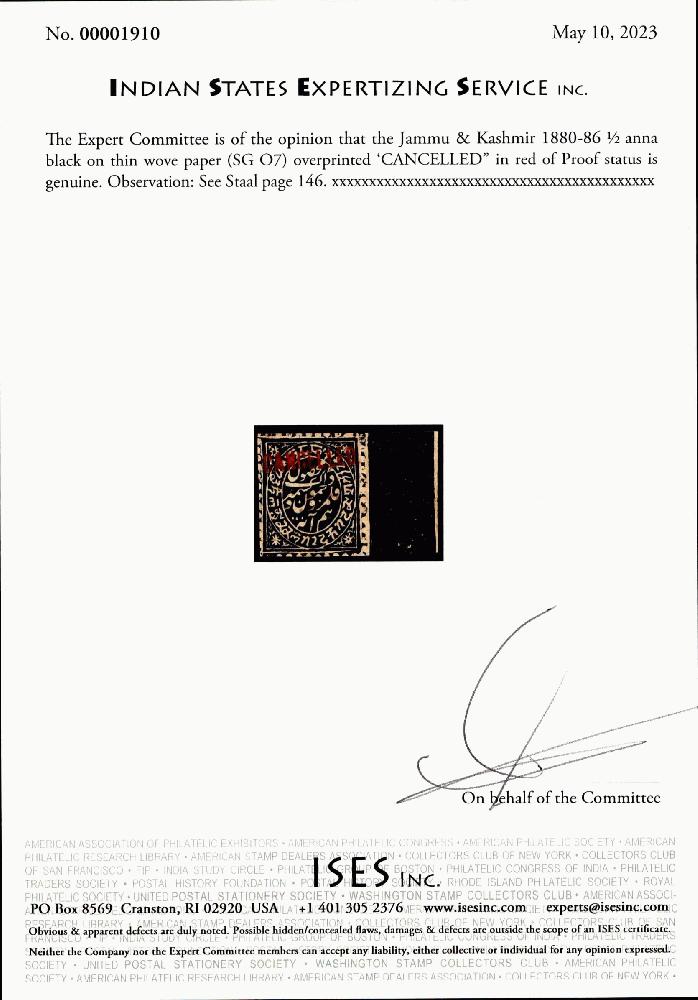 | Zusatzinformationen und Suchstichworte: | India and States Auction 25. Juni 2023 Los 98 Indien Staaten Kashmir Jammu und Kashmir 1883-94 Probe des ½ anna schwarz auf dünnem, genetztem Papier (SG O7) überdruckt gestempelt" in rot ohne Gummi als hergestellt, diese Proben sind dokumentiert in "die Briefmarken von Jammu und Kashmir" bei Kröseln Staal, Blatt 146. ISES Attest Ausruf 150,00 USD |