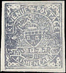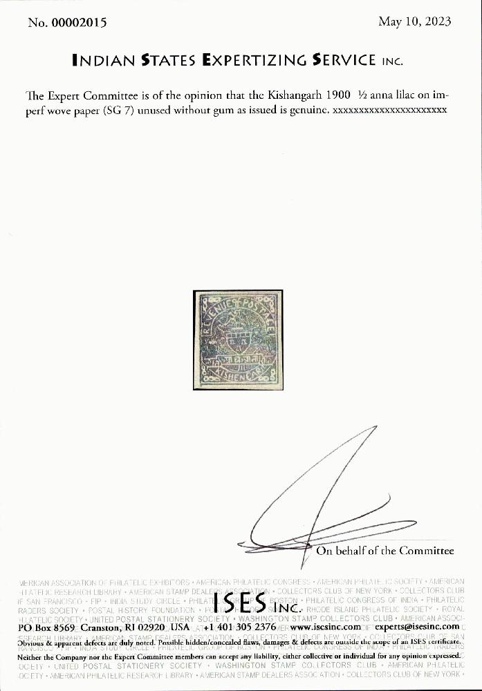 | Zusatzinformationen und Suchstichworte: | India and States Auction 25. Juni 2023 Los 100 Indien Staaten Kishengarh Kishangarh 1900 ½ anna lila auf ungezähnt Velinpapier (gegittertes Papier) (SG 7) ungebraucht ohne Gummi, wie verausgabt mit kleinere falzhell. ISES Attest Ausruf 150,00 USD |