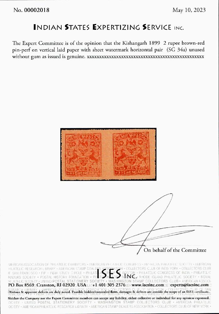 | Zusatzinformationen und Suchstichworte: | India and States Auction 25. Juni 2023 Los 104 Indien Staaten Kishengarh Kishangarh 1899 2 Rupien rotbraun Nadeldurchstich auf senkrecht gestreiftes Papier mit Bogenwasserzeichen waagrechtes Paar (SG 34a) ungebraucht ohne Gummi, wie verausgabt. ISES Attest Ausruf 65,00 USD |