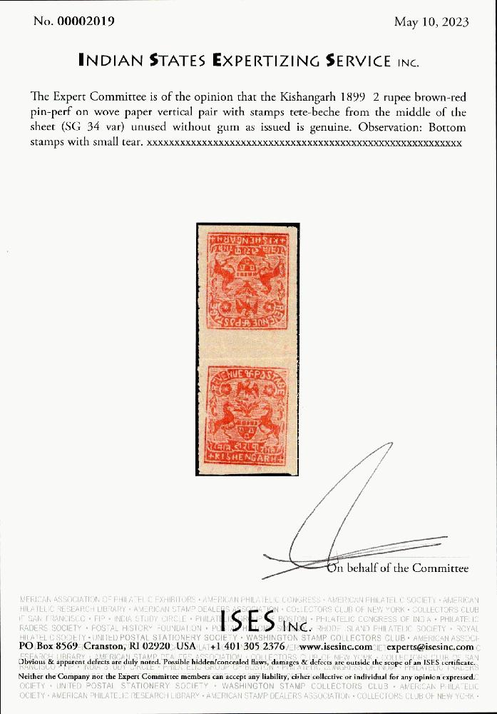 | Zusatzinformationen und Suchstichworte: | India and States Auction 25. Juni 2023 Los 105 Indien Staaten Kishengarh Kishangarh 1899 2 Rupien rotbraun Nadeldurchstich auf genetztem Papier senkrechtes Paar mit Briefmarken Kehrdrucke aus der mitte der Bogen (SG 34 var) ungebraucht ohne Gummi, wie verausgabt, untere Marke mit Randriss. ISES Attest Ausruf 75,00 USD |