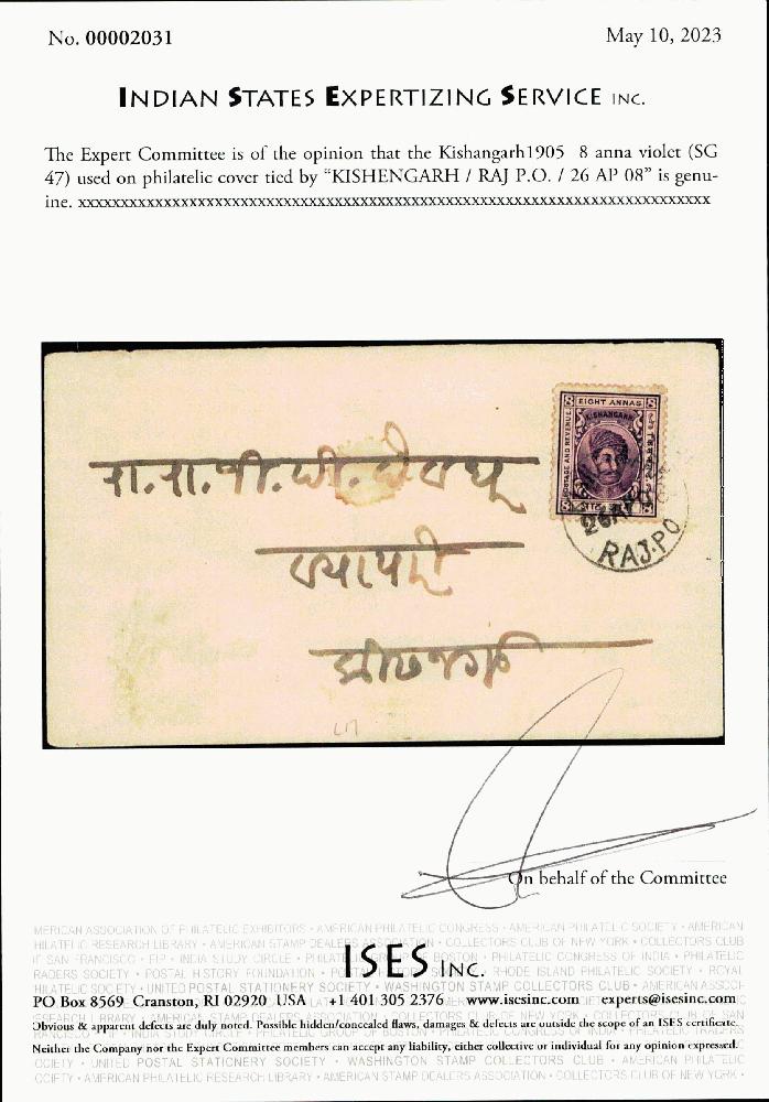| Zusatzinformationen und Suchstichworte: | India and States Auction 25. Juni 2023 Los 107 Indien Staaten Kishengarh Kishangarh 1905 8 anna violett (SG 47) gebraucht auf philatelistischem Brief entwertet mit "KISHENGARH/RAJ Post Office/26 AP 08". ISES Attest Ausruf 200,00 USD |