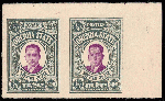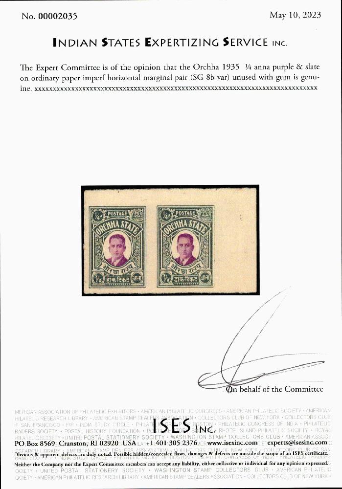 | Zusatzinformationen und Suchstichworte: | India and States Auction 25. Juni 2023 Los 122 Indien Staaten Orchha Orchha 1935 ¼ anna purpur und schiefer auf gewöhnlichem Papier ungezähnt waagrechtes Randpaar (SG 8b var) ungebraucht. ISES Attest Ausruf 75,00 USD |