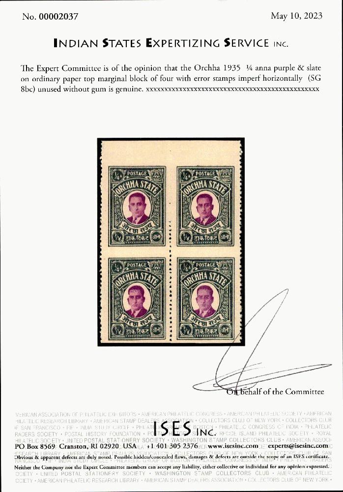 | Zusatzinformationen und Suchstichworte: | India and States Auction 25. Juni 2023 Los 124 Indien Staaten Orchha Orchha 1935 ¼ anna purpur und schiefer auf gewöhnlichem Papier oben Randviererblock mit Fehler Briefmarken ungezähnt waagrecht (SG 8bc) ungebraucht ohne Gummi. ISES Attest Ausruf 75,00 USD |