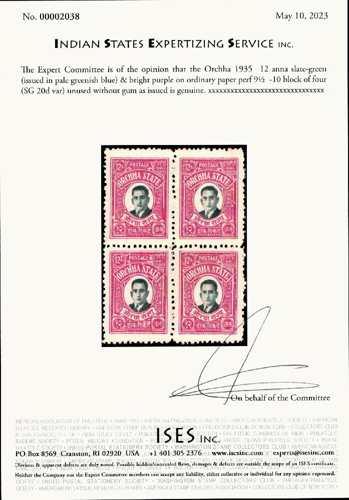 | Zusatzinformationen und Suchstichworte: | India and States Auction 25. Juni 2023 Los 123 Indien Staaten Orchha Die Fachmann Ausschuss ist des Meinung jenes die Orchha 1935 12 anna schiefergrün (ausgestellt in hellgrünlichblau) und leuchtend purpur auf gewöhnlichem Papier gezähnt 9½ - 10 Viererblock (SG 20d var) ungebraucht ohne Gummi, wie verausgabt. ISES Attest Ausruf 250,00 USD |