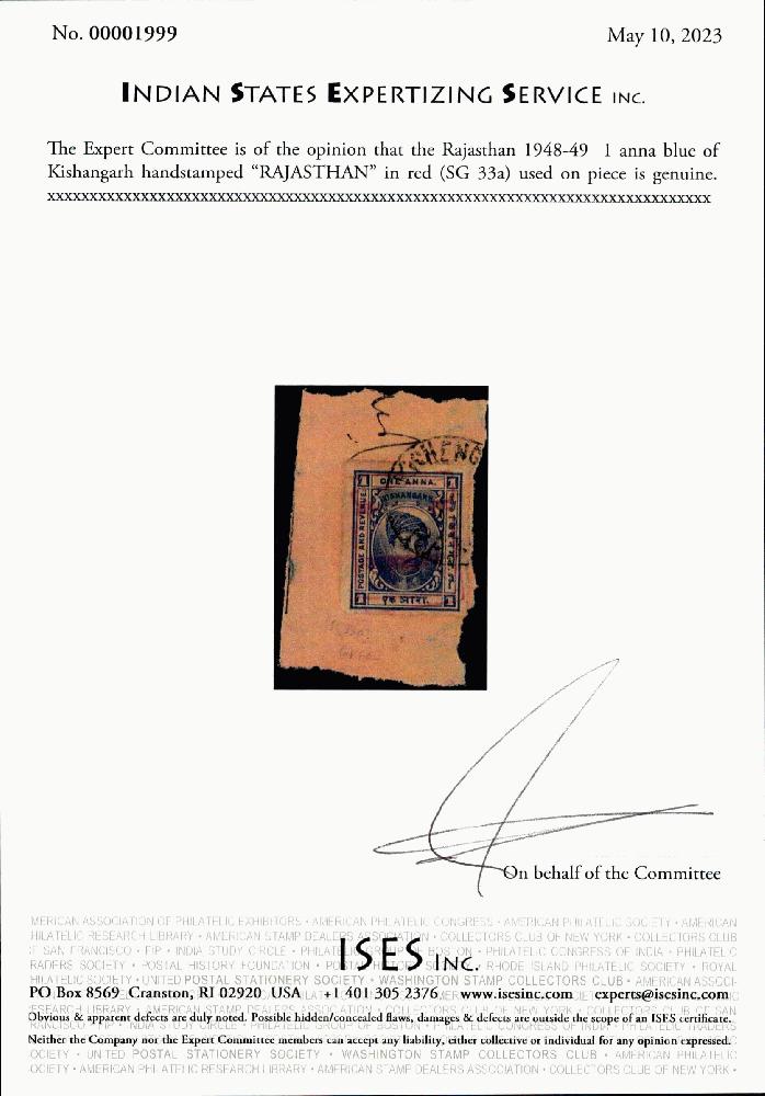 | Zusatzinformationen und Suchstichworte: | India and States Auction 25. Juni 2023 Los 126 Indien Staaten Rajasthan Rajasthan 1948-49 1 anna blau von Kishangarh handgestempelt "RAJASTHAN" in rot (SG 33a) gestempelt auf Briefstück. ISES Attest Ausruf 1.500,00 USD |