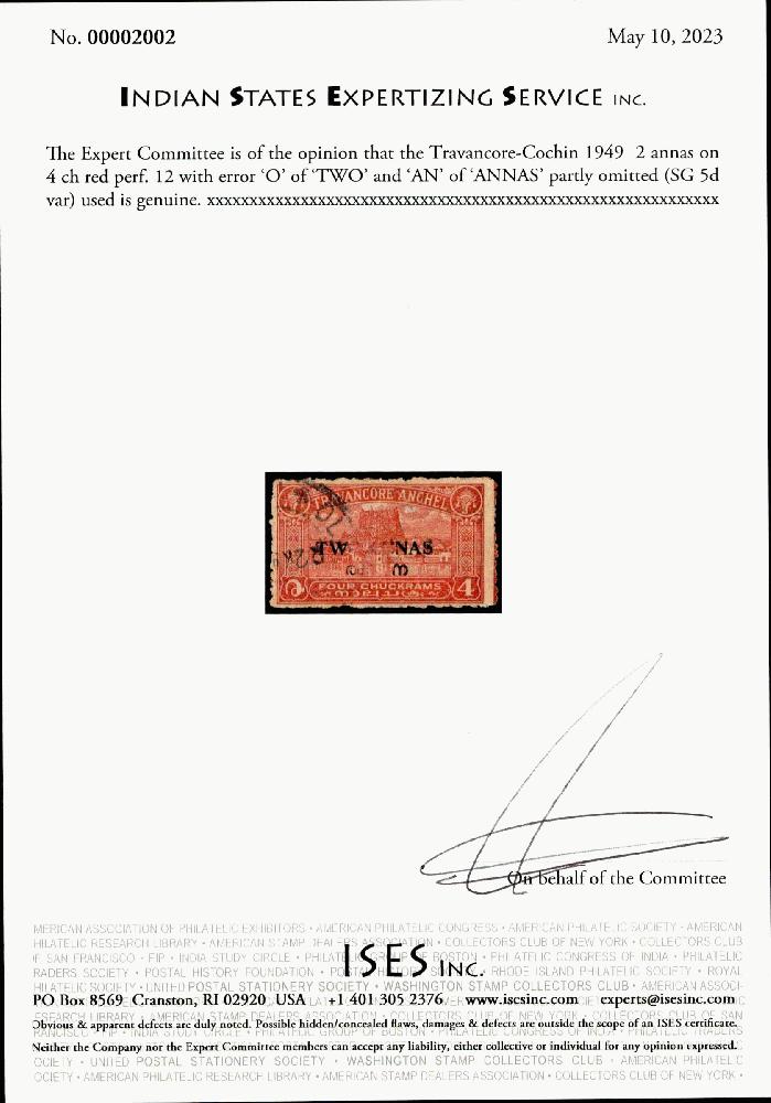 | Zusatzinformationen und Suchstichworte: | India and States Auction 25. Juni 2023 Los 132 Indien Staaten Travancore Cochin Travancore-Cochin 1949 2 annas auf 4 ch rot Zähnung 12 mit Fehler O von zwei und ein von ANNAS teils ausgelassen (SG 5d var) gebraucht. ISES Attest Ausruf 100,00 USD |