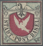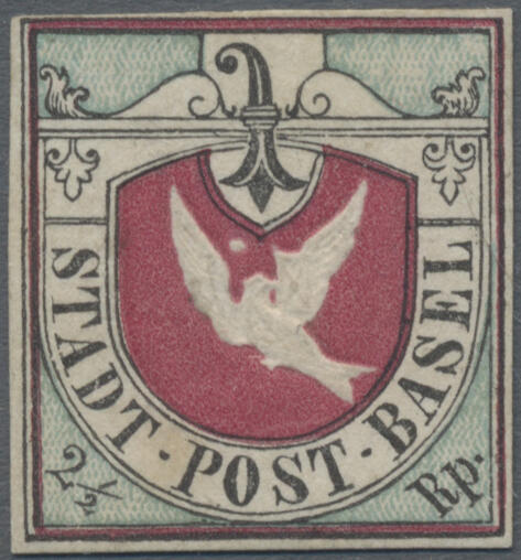 | Zusatzinformationen und Suchstichworte: | Christoph Gärtner 56. Auktion 12. - 16. Juni 2023 Los 4300 D Schweiz Kanton Basel 1845, 2½ Rp "Baslertaube" rot, blau und schwarz, zweite Auflage mit weißem Punkt oberhalb des Kopfes, ungebraucht ohne Gummi, sehr Farbfrisch, vierseitig gut bis sehr gut gerandet, im oberen Teil rückseitig verstärkt (repariert), sonst in guter Erhaltung. Mit schönem ausgeprägten Reliefdruck. Attest Marchand (2022) Ausruf 5.000,00 EUR |