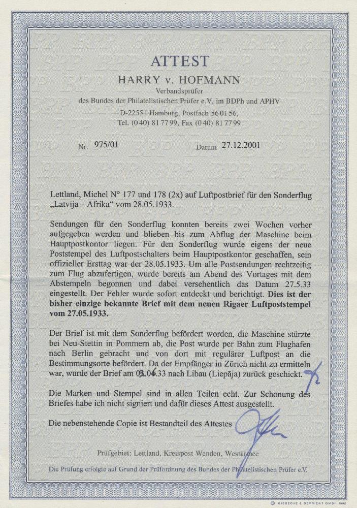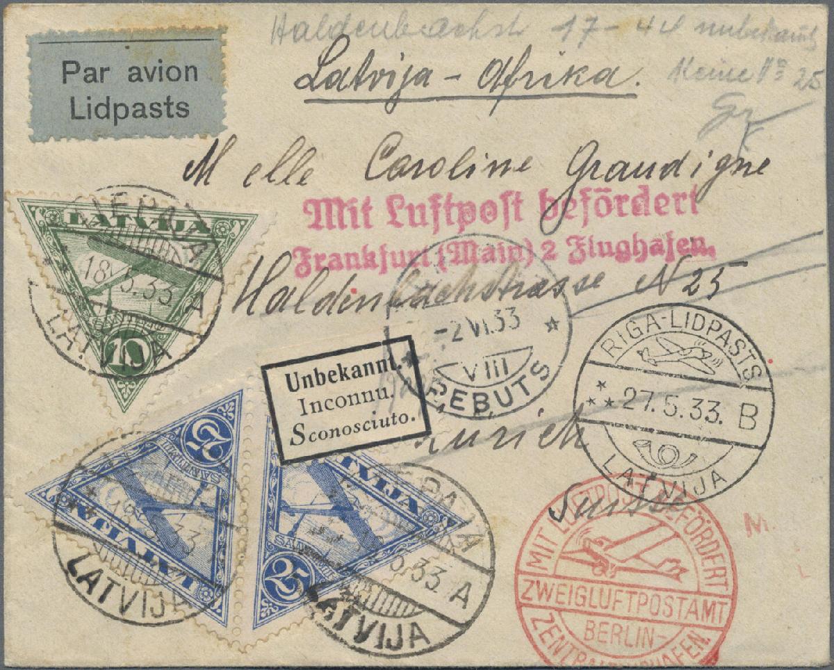 | Zusatzinformationen und Suchstichworte: | Christoph Gärtner 56. Auktion 12. - 16. Juni 2023 Los 3310 D Lettland 1933 LATVIA: Brief aus Liepaja in die Schweiz bei Sonderflüge Latvija-Afrika ab Riga über Berlin und Frankfurt, freigemacht 1931 Luft 10 c. und 25 c. Paar entwertet "LIEPAJA LATVIJA/18,5,33" Datumsstempel mit dem selten "RIGA-LIDPASTS/27,5,33" Datumsstempel Deutsch Luftpostbestätigungs Handstempel vorderseitiges, Berlin Datumstempel auf der Rückseite. Der Brief könnten nicht sein zugestelltes (Empfänger unbekannt) und zurückgeschickt. Dies ist die einzig bekannte Brief mit das Neue RIGA Luftpost Datumsstempel datiert 27,5,1933. H. V. Hofmann Attest. (aus Sammlung Harry v. Hofmann) Zuschlag 270,00 EUR |