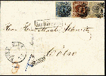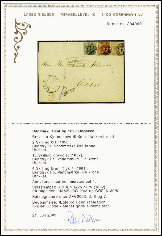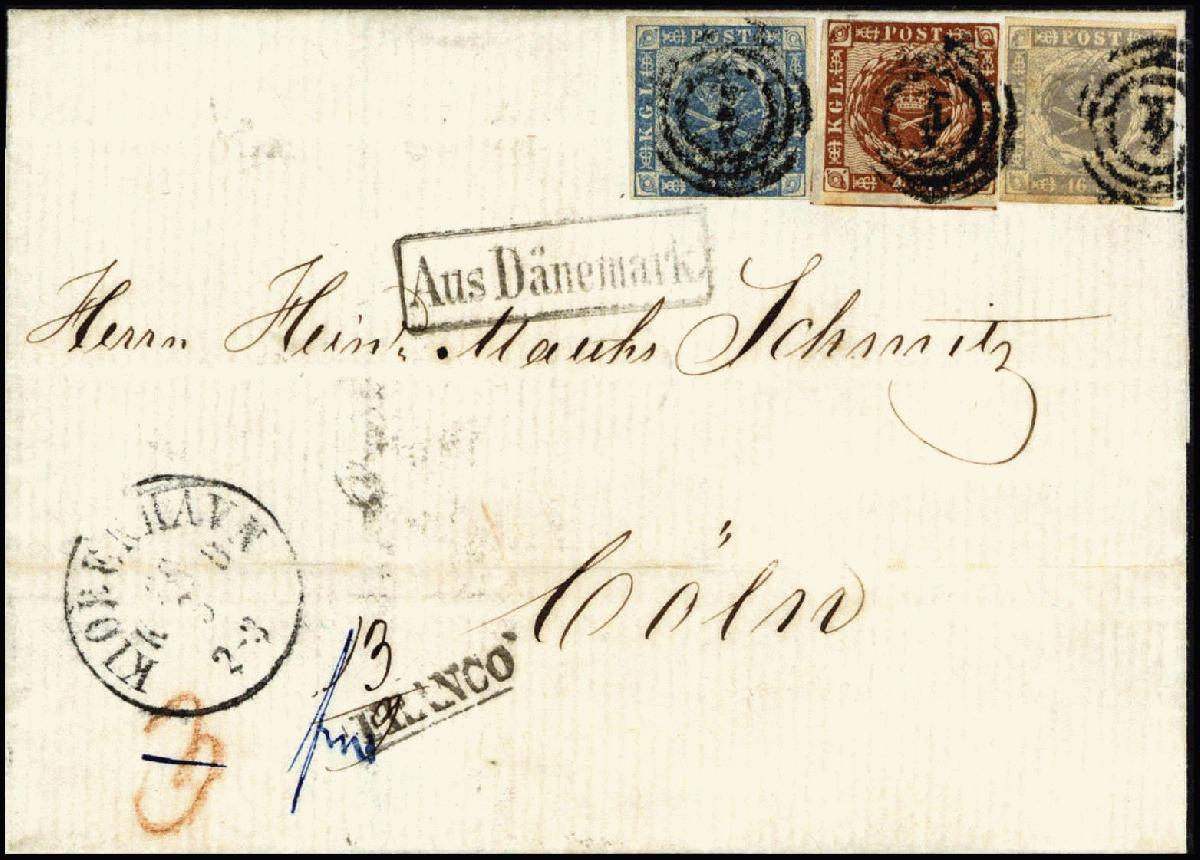 | Zusatzinformationen und Suchstichworte: | Württembergisches Auktionshaus 142. Versteigerung 23.-24. Juni 2023 Los 613 Dänemark 2 S. mit 4 S. rötlichbraun und 16 S. grau, drei frische und ringsum vollrandig geschnittene Kabinettstücke mit zentr. aufges. Stempeln "1" KOPENHAGEN auf sauberem, weißem Faltbrief (1862) via Hamburg nach Köln. In dieser Erhaltung eine seltene und besonders attraktive Dreifarben-Frankatur Ausruf 1.400,00 EUR |