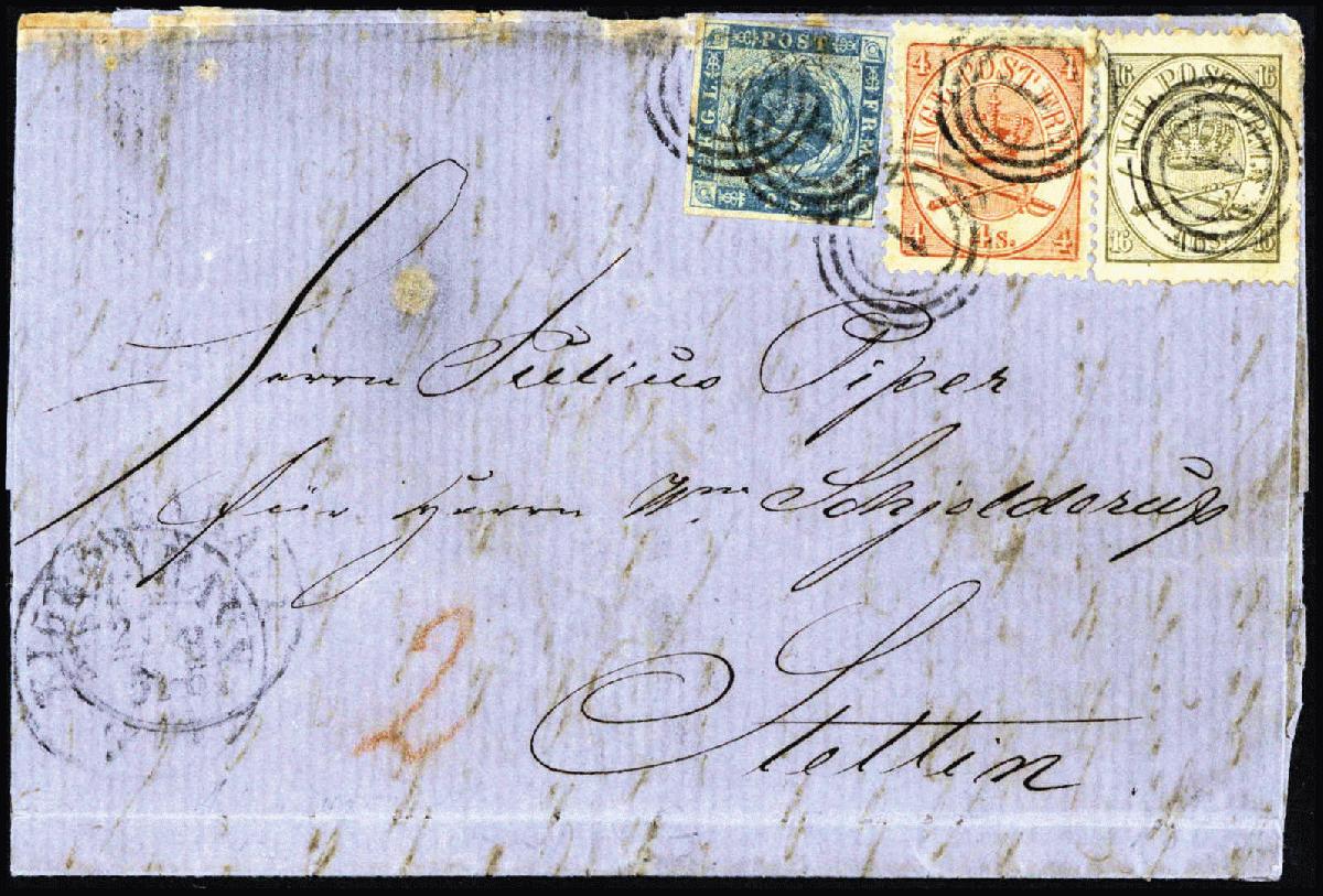 | Zusatzinformationen und Suchstichworte: | Württembergisches Auktionshaus 142. Versteigerung 23.-24. Juni 2023 Los 614 Dänemark 2 S. blau in Mischfrankatur mit 4 S. rot und 16 S. grauoliv, seltene Frankatur-Kombination auf blauem Brief nach Stettin, befördert via Lübeck (kl. Randfleckchen), klar aufges. Dreiringstempel "1" KOPENHAGEN Ausruf 750,00 EUR |