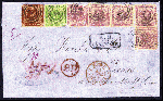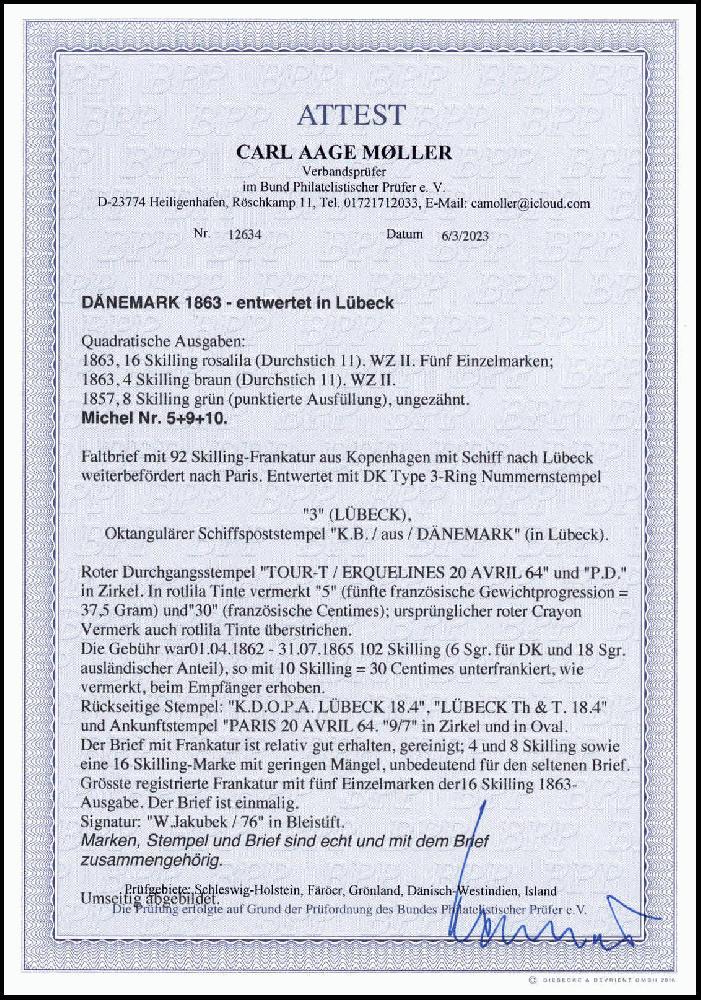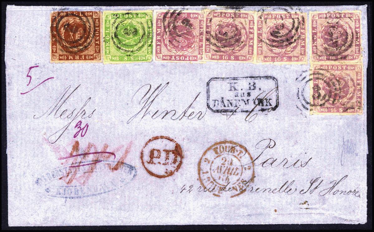 | Zusatzinformationen und Suchstichworte: | Württembergisches Auktionshaus 142. Versteigerung 23.-24. Juni 2023 Los 616 Dänemark 8 Sk. grün (Ausgabe 1857) in Mischfrankatur mit durchstochener Ausgabe 1863, 4 Sk. rötlichbraun und fünfmal 16 Sk. rotlila auf blauem Faltbrief nach Paris, zentr. aufges. Dreiringstempel "3" LÜBECK und Schiffspost-Aufgabestempel "K.B. aus DÄNEMARK". Etwas gereinigt und drei Marken mit kl. Unebenheiten, sonst in tadelloser Erhaltung. Es handelt sich bei dieser Frankatur um ein Unikat und zugleich um die größte registrierte Frankatur der 16-Sk.-Marke von 1863 Zuschlag 3.200,00 EUR |