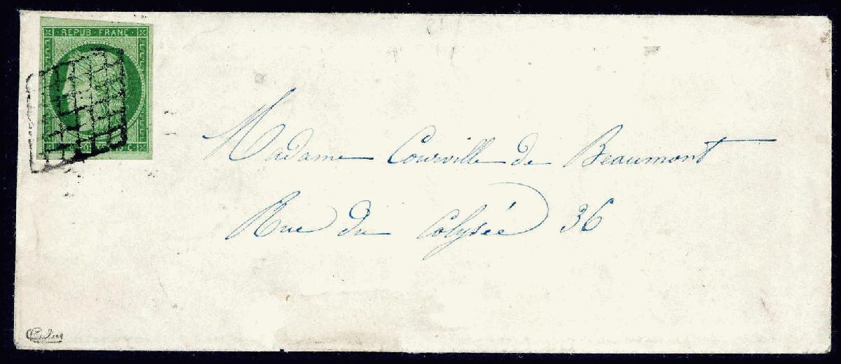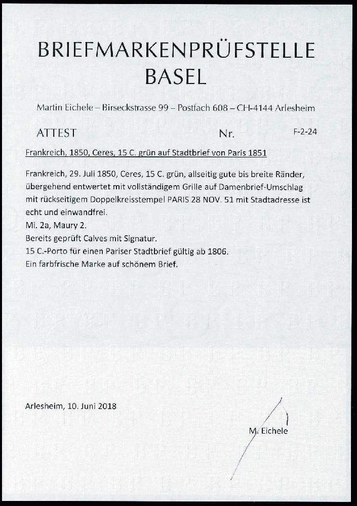 | Zusatzinformationen und Suchstichworte: | Württembergisches Auktionshaus 142. Versteigerung 23.-24. Juni 2023 Los 636 Frankreich 15 C., ringsum breitrandig geschnittenes Luxusstück in leuchtender Farbe und mit dekorativ aufges. Rautenstempel auf kl. weißem Ortsbrief, sign. Calves Ausruf 400,00 EUR |