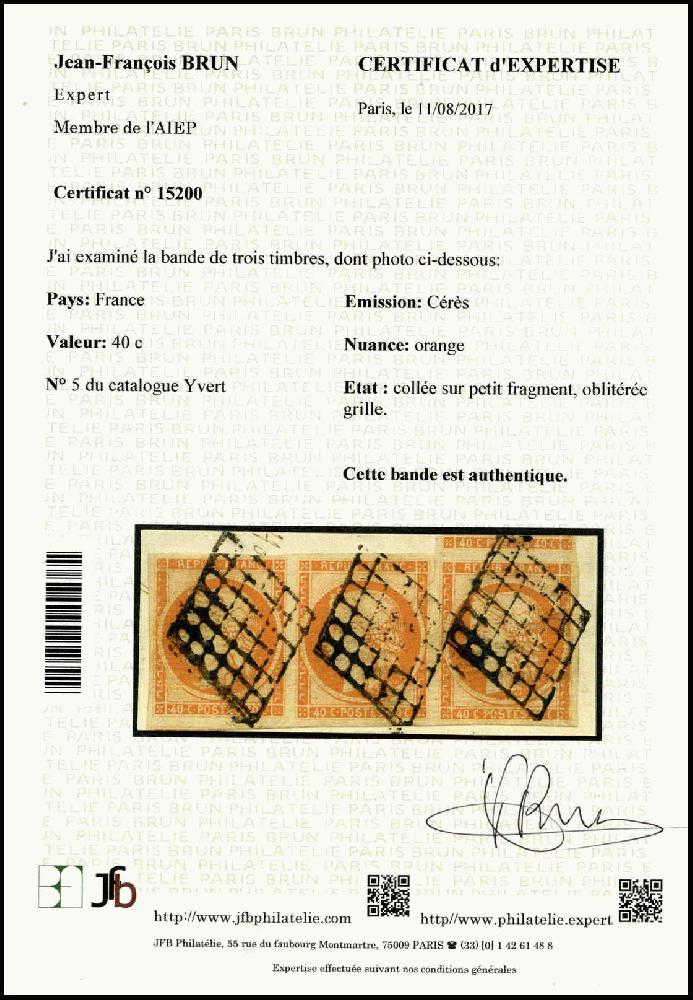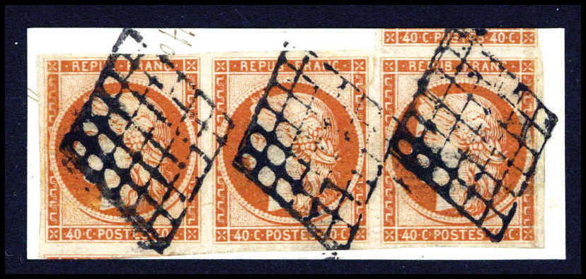 | Zusatzinformationen und Suchstichworte: | Württembergisches Auktionshaus 142. Versteigerung 23.-24. Juni 2023 Los 638 Frankreich 40 C., außergewöhnlich tieffarbiger, waagr. Luxus-Dreierstreifen, vorzüglich breit geschnitten (re. oben mit Teil der Nebenmarke) auf Briefstück mit drei sauber aufges. Gitterstempeln. Eine seltene Einheit in dieser hervorragenden Qualität Ausruf 600,00 EUR |