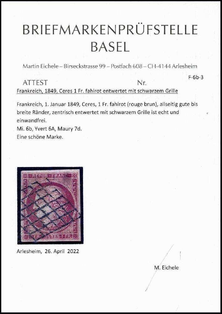 | Zusatzinformationen und Suchstichworte: | Württembergisches Auktionshaus 142. Versteigerung 23.-24. Juni 2023 Los 640 Frankreich 1 Fr. fahlrot, ringsum breitrandiges Luxusstück mit klar und sauber aufges. schwarzer Gitterraute. Ein Qualitätsstück dieser Europa-Rarität, Fotoattest Eichele ("Einwandfrei, eine schöne Marke") Zuschlag 3.000,00 EUR |