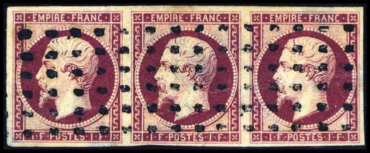 | Zusatzinformationen und Suchstichworte: | Württembergisches Auktionshaus 142. Versteigerung 23.-24. Juni 2023 Los 646 Frankreich 1 Fr. dunkelkarmin, ringsum gleichmäßig breitrandiger, waagr. Dreierstreifen in leuchtend frischer Farbe und mit zentr., gestochen klar aufges. Punktstempeln. Rs. ganz leichte Auffaserungen, sonst in perfekter Erhaltung. Eine extrem seltene Einheit Ausruf 1.000,00 EUR |