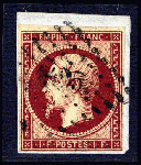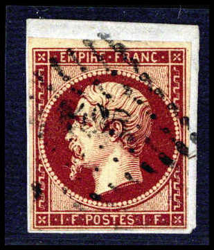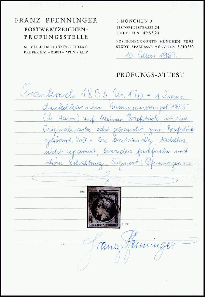 | Zusatzinformationen und Suchstichworte: | Württembergisches Auktionshaus 142. Versteigerung 23.-24. Juni 2023 Los 647 Frankreich 1 Fr. dunkelkarmin, besonders tieffarbiges Kabinett-Bfstk. mit zentr. aufges. Nummernstpl."1495" LE HAVRE. Eine sehr seltene Marke in ausgezeichneter Erhaltung Ausruf 1.000,00 EUR |
