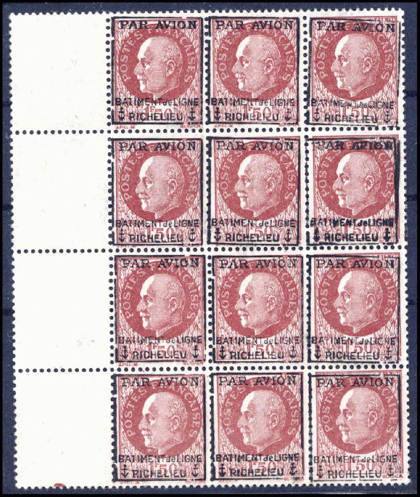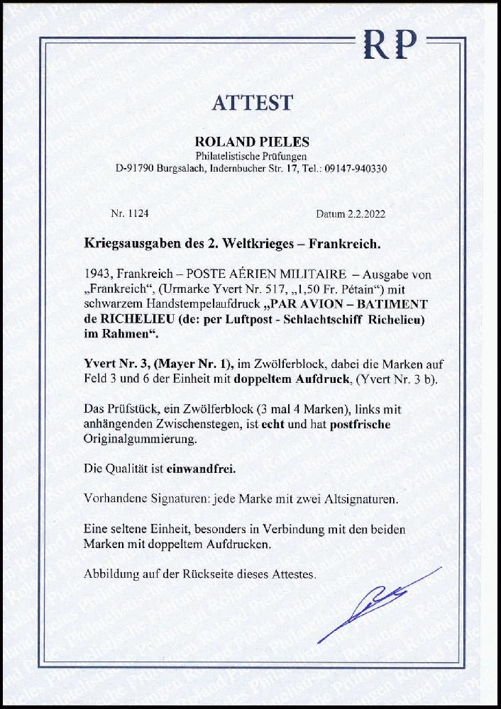 | Zusatzinformationen und Suchstichworte: | Württembergisches Auktionshaus 142. Versteigerung 23.-24. Juni 2023 Los 708 Frankreich Lokalausgaben Luftpost, Schlachtschiff Richelieu 1,50 Fr. in tadellos postfr. Zwölferblock (li. mit anhäng. Zwischenstegen), zwei Marken (Feld 3 und 6) mit Abart: doppelter Aufdruck (Yvert 3b). In dieser Form eine extrem seltene Einheit (Mayer 4.100,-Euro), Fotoattest Pieles. Ausruf 1.000,00 EUR |