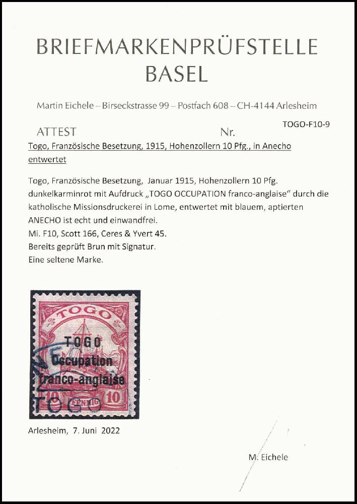 | Prüfgebiet: | Deutsche Kolonien Togo Französische Besetzung |