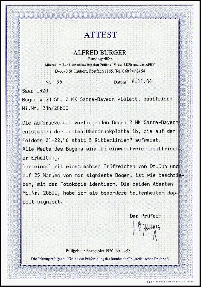 | Prüfgebiet: | Saargebiet (Mi-Nr. 1 - 205) |