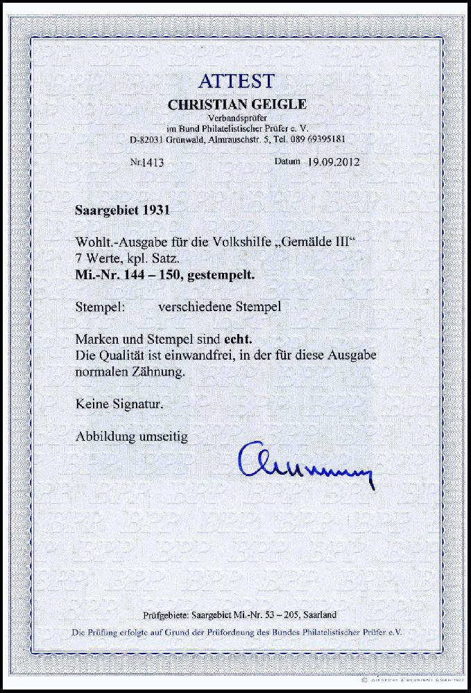 | Prüfgebiet: | Saargebiet (Mi-Nr. 1 - 205) |