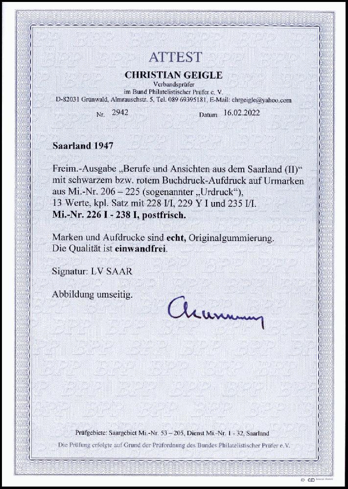 | Prüfgebiet: | Saarland (ab Mi-Nr. 206) |