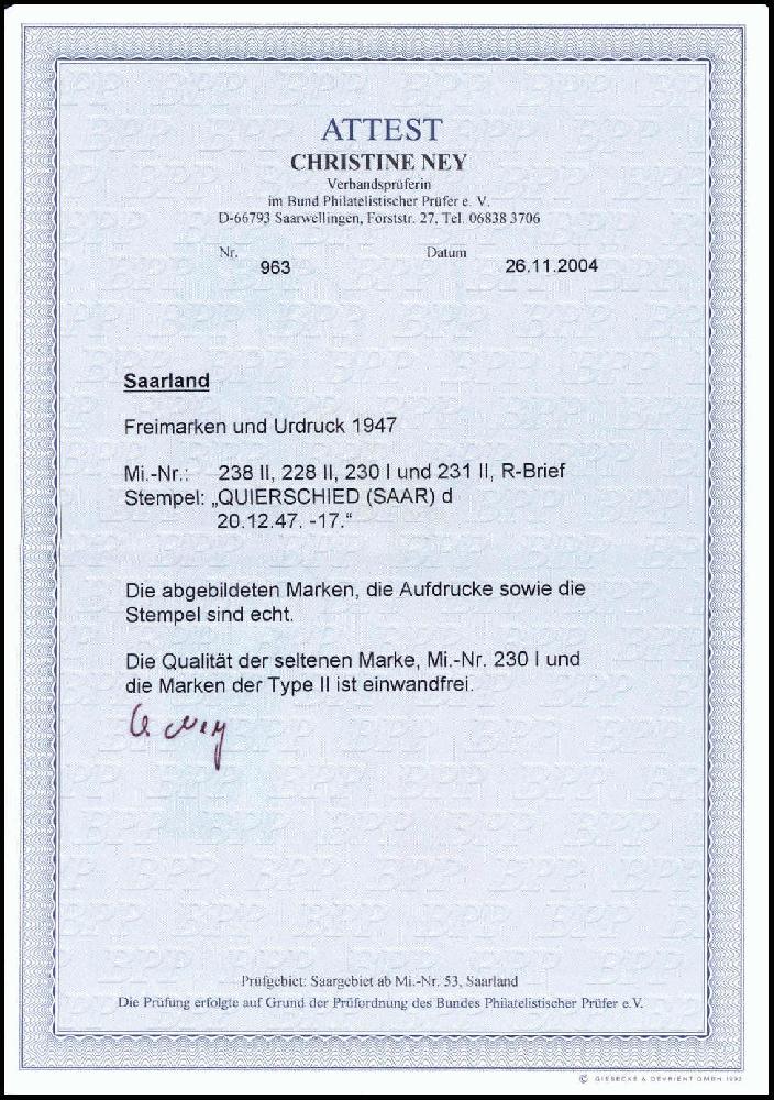 | Prüfer: | Ney, Christine (BPP (Bund Philatelistischer Prüfer)) |