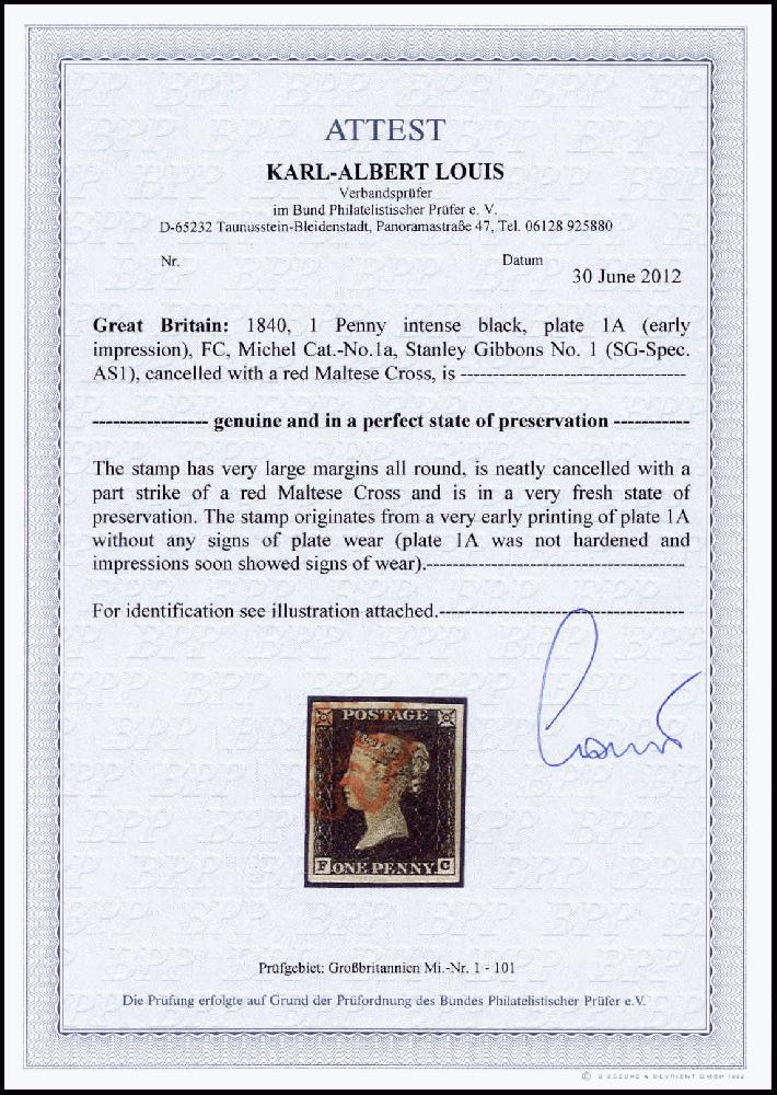 | Zusatzinformationen und Suchstichworte: | Württembergisches Auktionshaus 142. Versteigerung 23.-24. Juni 2023 Los 724 Grossbritannien 1 P. tiefschwarz, Platte 1A (Early Impression), FC, schönes und breitrandiges Luxusstück mit rotem Malteserkreuz. Seltener Frühdruck von Platte I Zuschlag 200,00 EUR |