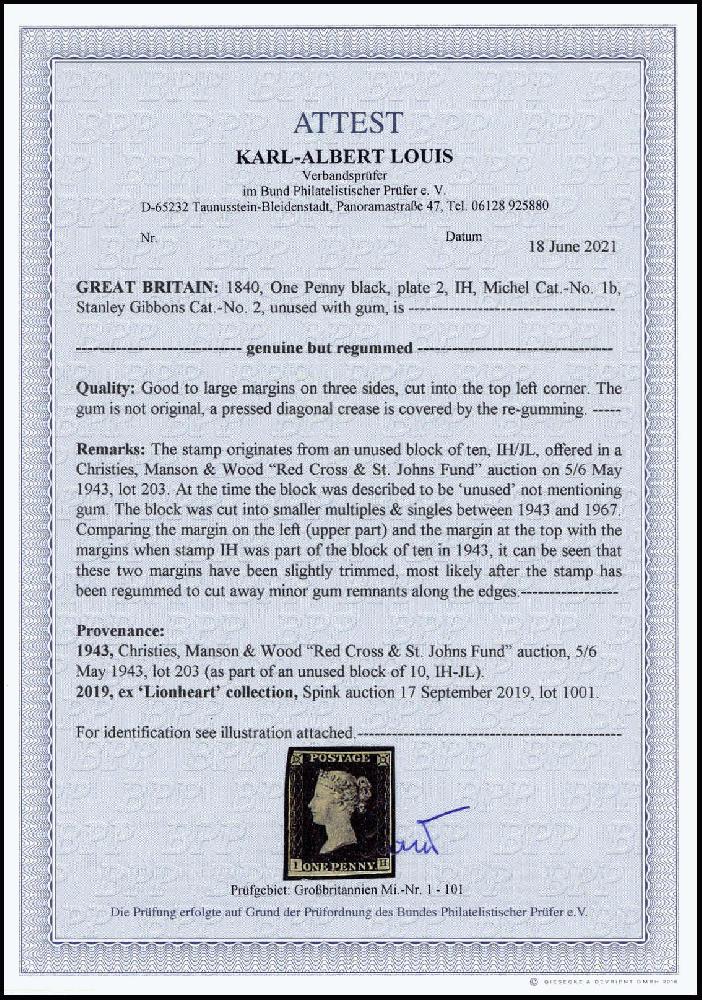 | Zusatzinformationen und Suchstichworte: | Württembergisches Auktionshaus 142. Versteigerung 23.-24. Juni 2023 Los 725 Grossbritannien 1 P. schwarz, Platte II ("IH"), ungebrauchtes, vorzüglich farbfrisches Exemplar, li. oben leicht berührt, sonst ringsum vollrandig (leichte Bugspur und Gummierung teils erneuert). Eine extrem seltene Marke, welche aus einem aufgeteilten Zehnerblock stammt. Ex "Lionheart-Collection" (Spink 17/9 19, Los 1001) Ausruf 600,00 EUR |