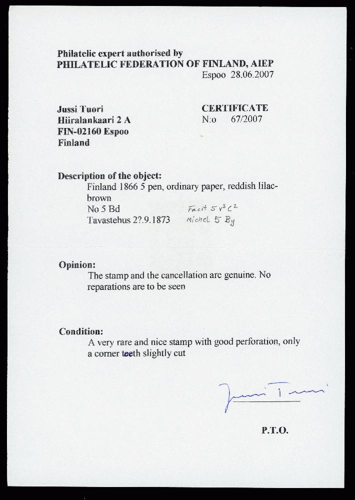 | Zusatzinformationen und Suchstichworte: | Klüttermann - 6. Auktion 27. Juli - 4. August 2023 Los 10699 Finnland 5 Penni braunlila auf gewöhnlichem Papier Durchstich B mit allen Zungen und sauberem K1 TAVASTEHUS 1873, eine extrem seltene Marke mit FA Tuori und Attest Ossa (unten sog. durchstochen wie typisch bei dieser Marke.., die Marke ist besonders gut wie im Attest geschildert", nur ein Eckzahn ist unmerklich verkürzt (lt. Ossa ohne Bedeutung) , ein Top Stück dieser Rarität, fehlend in nahezu allen Sammlungen Katalogwert: 7000 Ausruf 2.000,00 EUR |