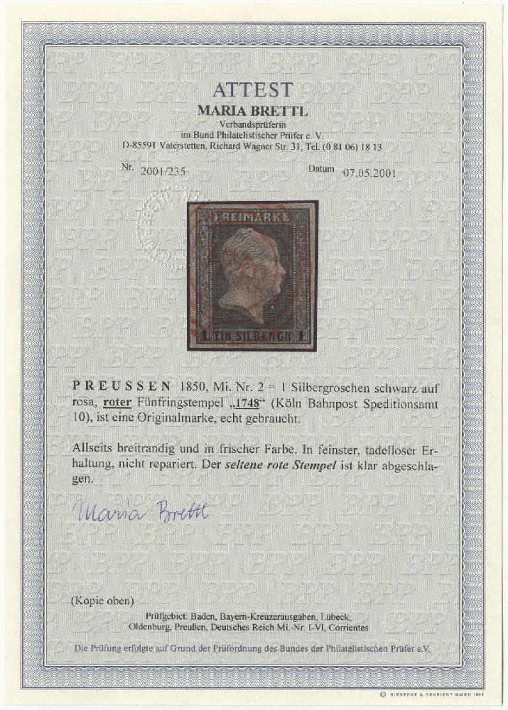 | Zusatzinformationen und Suchstichworte: | 72. Deider Auktion 29. Juni - 1. Juli 2023 Los 30 Altdeutschland Preussen 1 Sgr. schwarz a. rosa, breitrandiges Luxusstück mit zentr. rotem Fünfringstempel "1748" KÖLN BAHNPOST Ausruf 250,00 EUR |