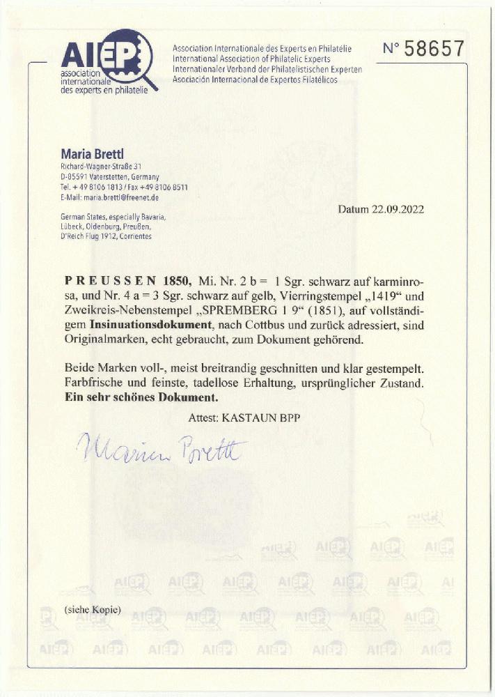 | Zusatzinformationen und Suchstichworte: | 72. Deider Auktion 29. Juni - 1. Juli 2023 Los 34 Altdeutschland Preussen 1 Sgr. schwarz a. karminrosa mit 3 Sgr. schw. a. gelb, Kabinett-Insinuationsdokument mit klarem "1419" und "SPREMBERG" nach Cottbus und zurück, sehr attraktiv Ausruf 180,00 EUR |