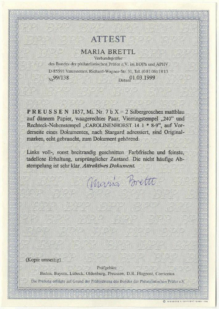| Prüfer: | Brettl, Maria (BPP (Bund Philatelistischer Prüfer)) |