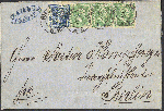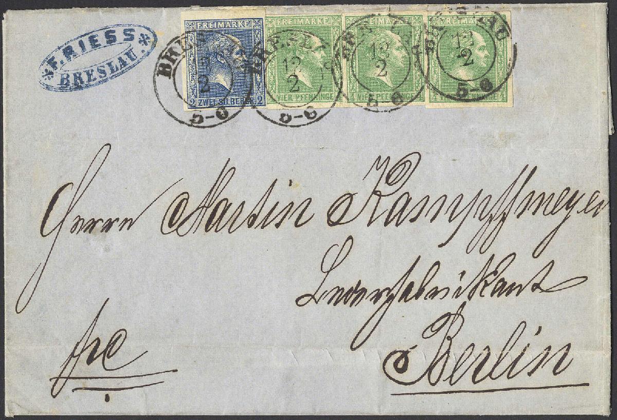 | Zusatzinformationen und Suchstichworte: | 72. Deider Auktion 29. Juni - 1. Juli 2023 Los 50 Altdeutschland Preussen 4 Pfge. grün, drei Exemplare (links min. ber.) zusammen mit 2 Sgr. dunkelblau auf kpl. Luxusbrief von "BRESLAU" Ausruf 600,00 EUR |