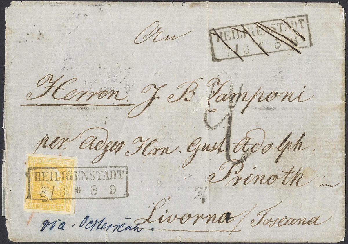 | Zusatzinformationen und Suchstichworte: | 72. Deider Auktion 29. Juni - 1. Juli 2023 Los 54 Altdeutschland Preussen 1858, 3 Sgr. gelborange auf dekorativem Teilfranko-Umschlag (leichte Beförderungsspuren) von "HEILIGENSTADT" via Österreich und Mailand nach Livorno/Toscana Ausruf 600,00 EUR |