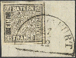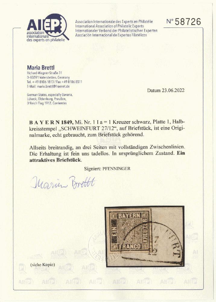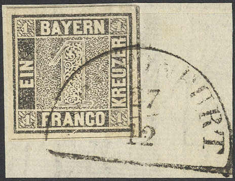 | Zusatzinformationen und Suchstichworte: | 72. Deider Auktion 29. Juni - 1. Juli 2023 Los 1019 Altdeutschland Bayern 1 Kreuzer schwarz, Platte 1, allseits breitrandiges, attraktives Luxus-Briefstück, an drei Seiten mit vollständigen Zwischenlinien und HKS "SCHWEINFURT 27/12" Ausruf 1.800,00 EUR |