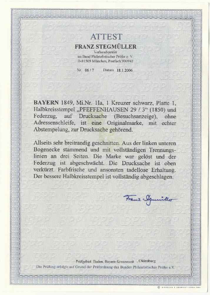 | Zusatzinformationen und Suchstichworte: | 72. Deider Auktion 29. Juni - 1. Juli 2023 Los 1021 Altdeutschland Bayern 1 Kreuzer schwarz, Platte 1, allseits sehr breitrandig mit drei vollständigen Trennungslinien aus der linken unteren Bogenecke auf Drucksache (Besuchsanzeige, ohne Adressenschleife) mit kpl. HKS "PFEFFENHAUSEN 29/3" und abgeschwächtem Federzug, die Marke war gelöst, Drucksache ist oben verkürzt, ansonsten tadellos Ausruf 2.200,00 EUR |