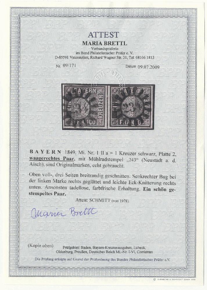 | Zusatzinformationen und Suchstichworte: | 72. Deider Auktion 29. Juni - 1. Juli 2023 Los 1033 Altdeutschland Bayern 1 Kreuzer schwarz, Platte 2, im waager. Prachtpaar (leichte Bug- und Knitterspuren), je mit zentr. Mühlradstempel "234" (Neustadt a.d. Aisch) Ausruf 1.500,00 EUR |